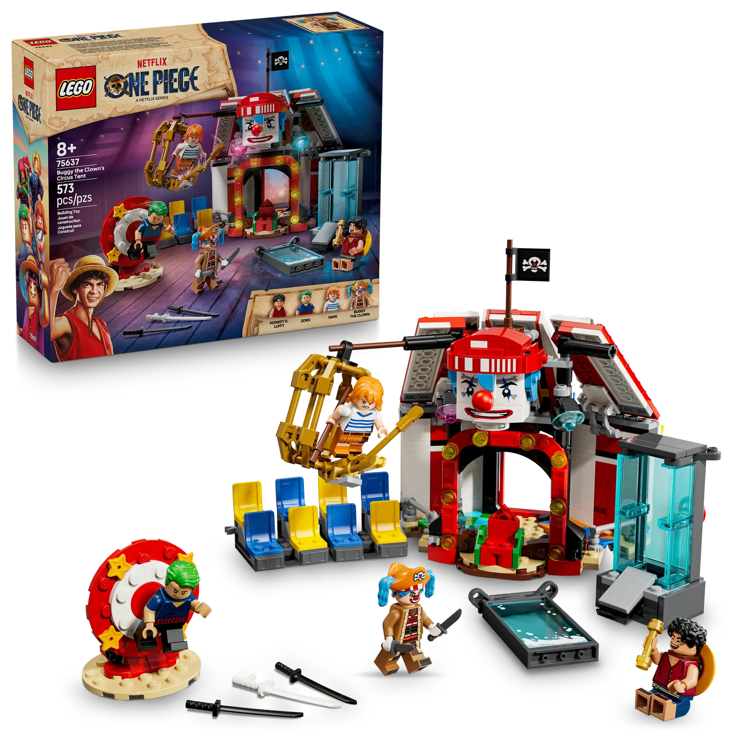 LEGO® ONE PIECE Buggy the Clown’s Circus Tent (75637) takes kids on a ONE PIECE circus adventure. This LEGO anime toy for boys and girls aged 8 and up has lots of accessories to help kids role-play their favorite scenes from the ONE PIECE live action series and to inspire them to create imaginative adventures of their own. The set comes with minifigures of Luffy, Zoro, Nami and pirate captain Buggy the Clown.